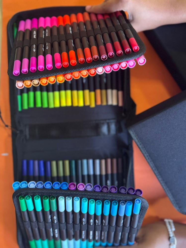 Dê vida às suas criações com oEstojo 100 Brush Pen Ponta Dupla, o kit definitivo para artistas, ilustradores, calígrafos e amantes da criatividade. Com 100 cores vibrantes, suaves e bem pigmentadas, você tem liberdade total para desenhar, colorir, fazer lettering, pintar mandalas, bullet journal e muito mais.