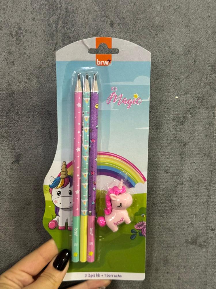 Leve mais magia para o seu material escolar com o encantador Kit Unicórnio! Composto por 3 lápis HB com estampas delicadas e uma borracha temática super fofa, esse kit é perfeito para escrever, desenhar e se divertir na escola ou em casa.