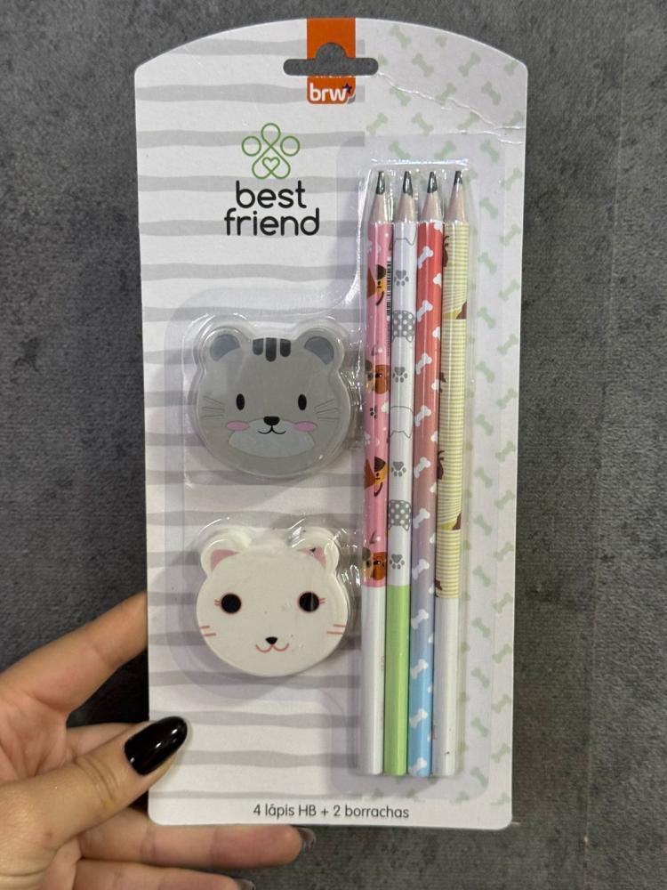 Escreva com estilo e diversão com o Kit Best Friend! Composto por 4 lápis HB decorados e borrachas temáticas super fofas, é perfeito para compartilhar com seu melhor amigo ou deixar seu material escolar ainda mais criativo!