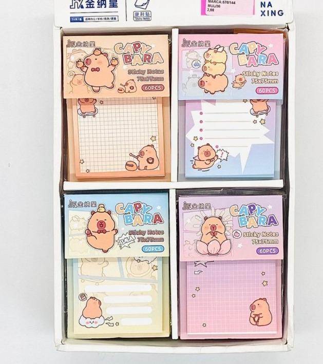 Conjunto de sticky notes 7,5 x 7,5 cm com ilustrações fofas de capivaras em diferentes cores e estilos. Perfeito para recados, organização e decoração de planners!