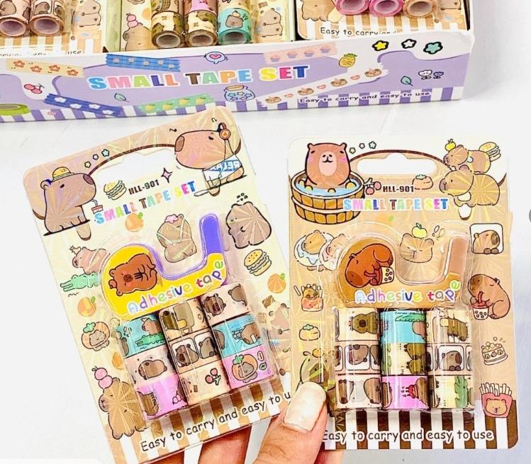 Conjunto super fofo com 8 mini fitas adesivas decoradas com capivaras em diferentes cenários e cores. Acompanha dispenser portátil. Ideal para planners, scrapbooks e decoração criativa!