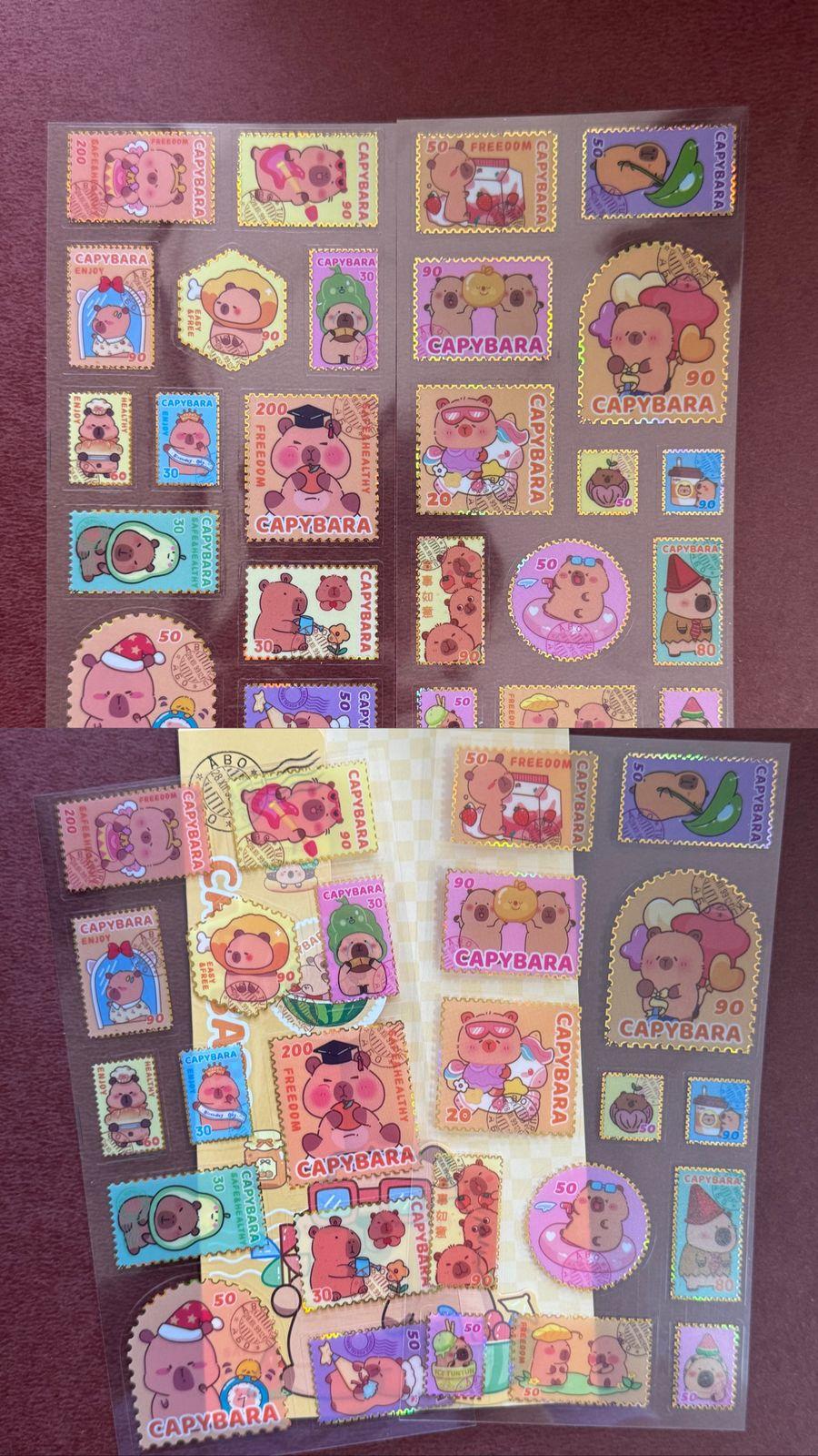 Adesivos em formato de selos postais com capivaras em diferentes fantasias e situações divertidas. Cores vibrantes, detalhes dourados e muito charme para decorar cadernos, cartas, planners ou colecionar! 💌✨