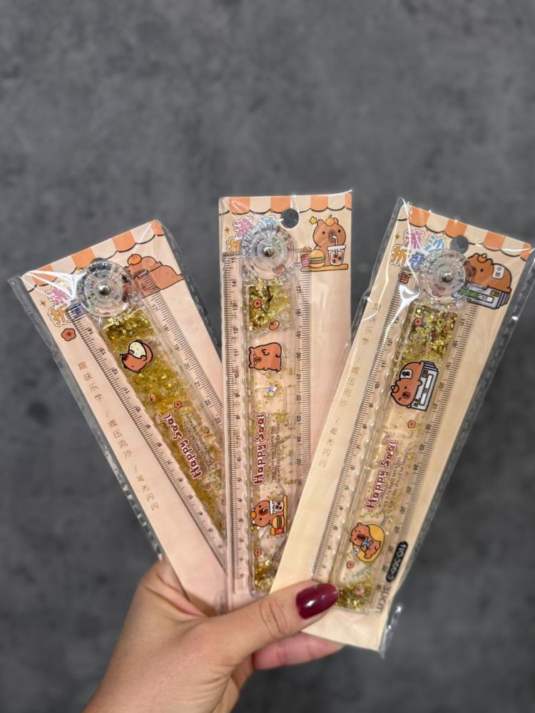 Régua retrátil de 30cm com tema capivara, perfeita para uso escolar ou escritório. Compacta e prática, possui design divertido com ilustrações de capivaras fofas. Ideal para quem gosta de itens funcionais e cheios de personalidade!