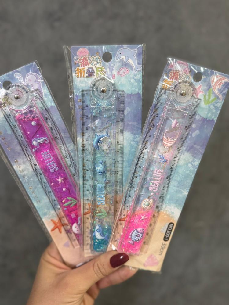 Régua retrátil de 30cm com tema "Sea Life", disponível em cores vibrantes e decorada com elementos do fundo do mar como peixes, golfinhos e conchas. Contém glitter e líquido interno que se movimentam, criando um efeito visual encantador. Ideal para deixar o material escolar mais divertido!