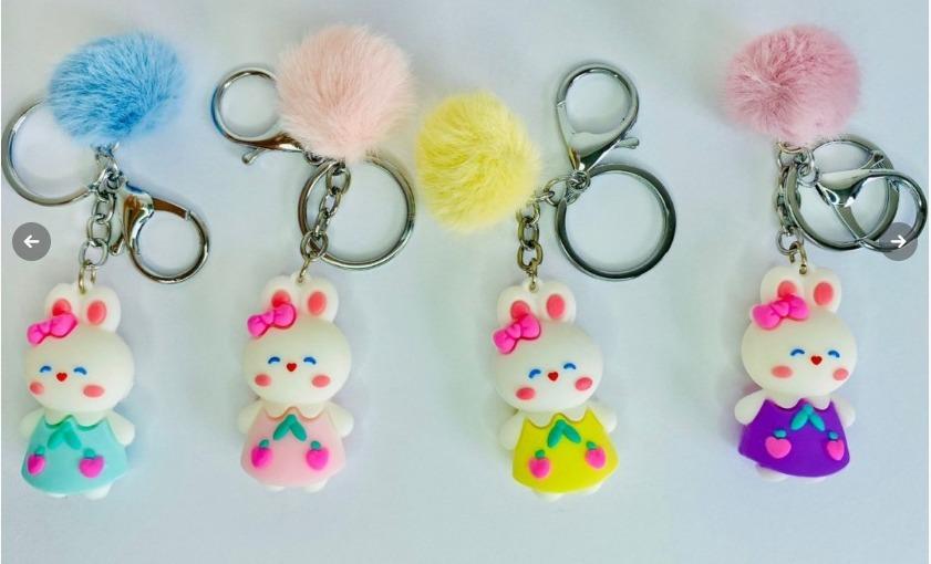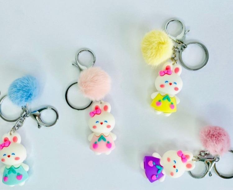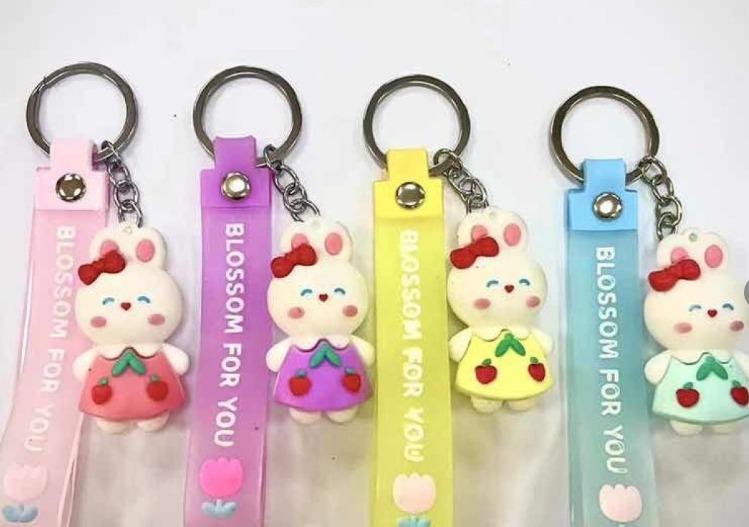 Chaveiros super fofos com coelhinhos em vestidos coloridos e frase "Blossom For You" na alça de silicone. Disponíveis em várias cores (rosa, roxo, amarelo e azul), são perfeitos para decorar chaves, mochilas ou estojos com um toque de delicadeza e diversão!