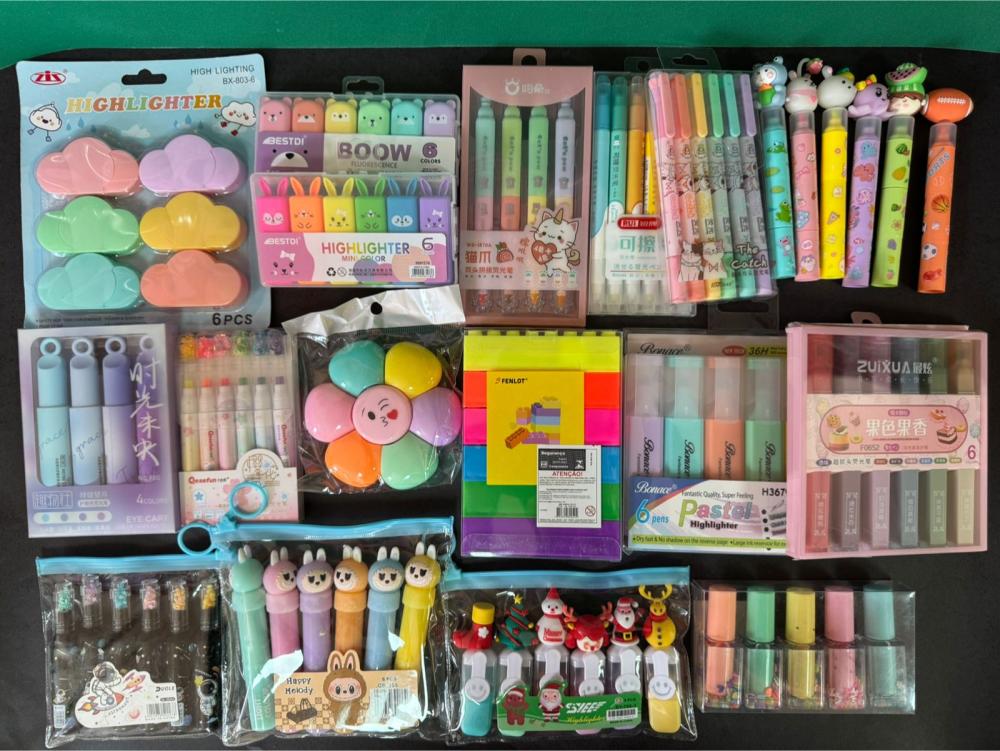 Um combo maravilhoso com 22 modelos diferentes de marca-texto, incluindo cores vibrantes, opções com cheirinho, ponta dupla, temáticos e formatos super divertidos como gatinho, unicórnio, coelhinho, nuvem, esmalte e muito mais! 💖