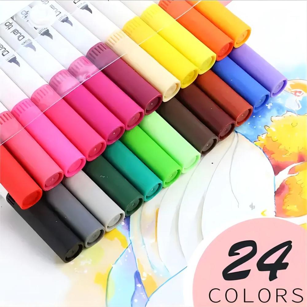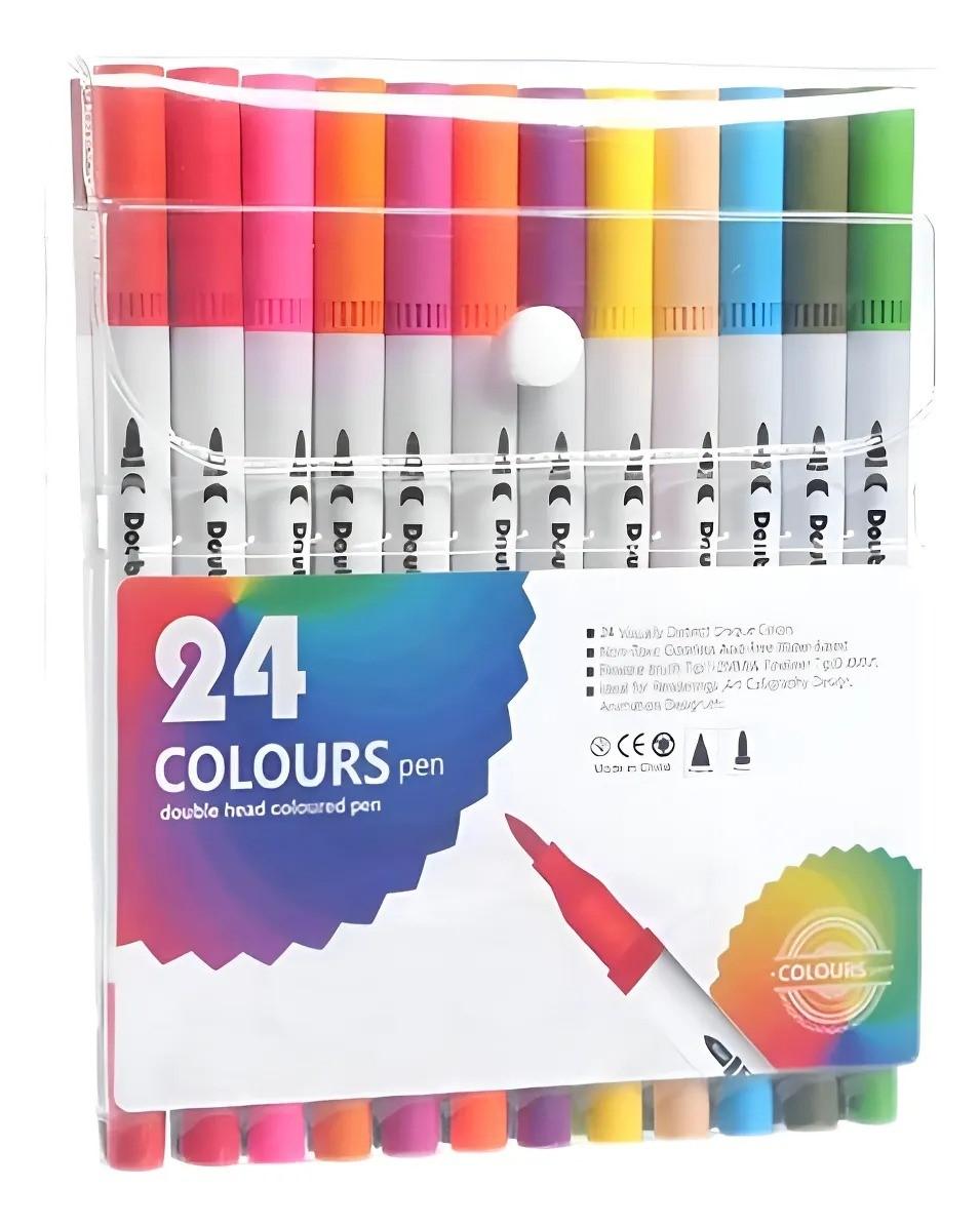 Conjunto com 24 canetas coloridas de ponta dupla, ideal para lettering, caligrafia, desenhos e anotações criativas. Possuem tinta à base de água, não tóxica, com ponta fina para detalhes e ponta pincel para traços suaves. Cores vivas e variadas para uso artístico ou escolar.