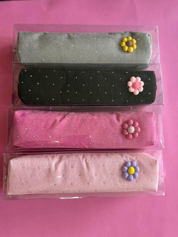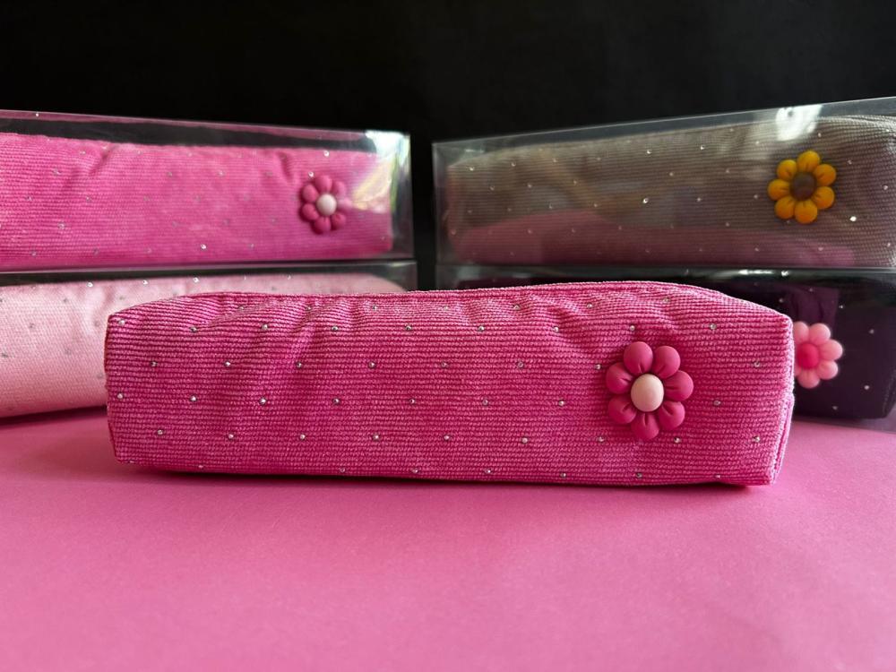 Um estojo delicado e super charmoso, com detalhes em strass que trazem um brilho especial ✨. Cada unidade vem com uma florzinha aplicada 🌸, deixando tudo ainda mais encantador. Perfeito para organizar canetas, lápis e acessórios do dia a dia 📚🖊️.