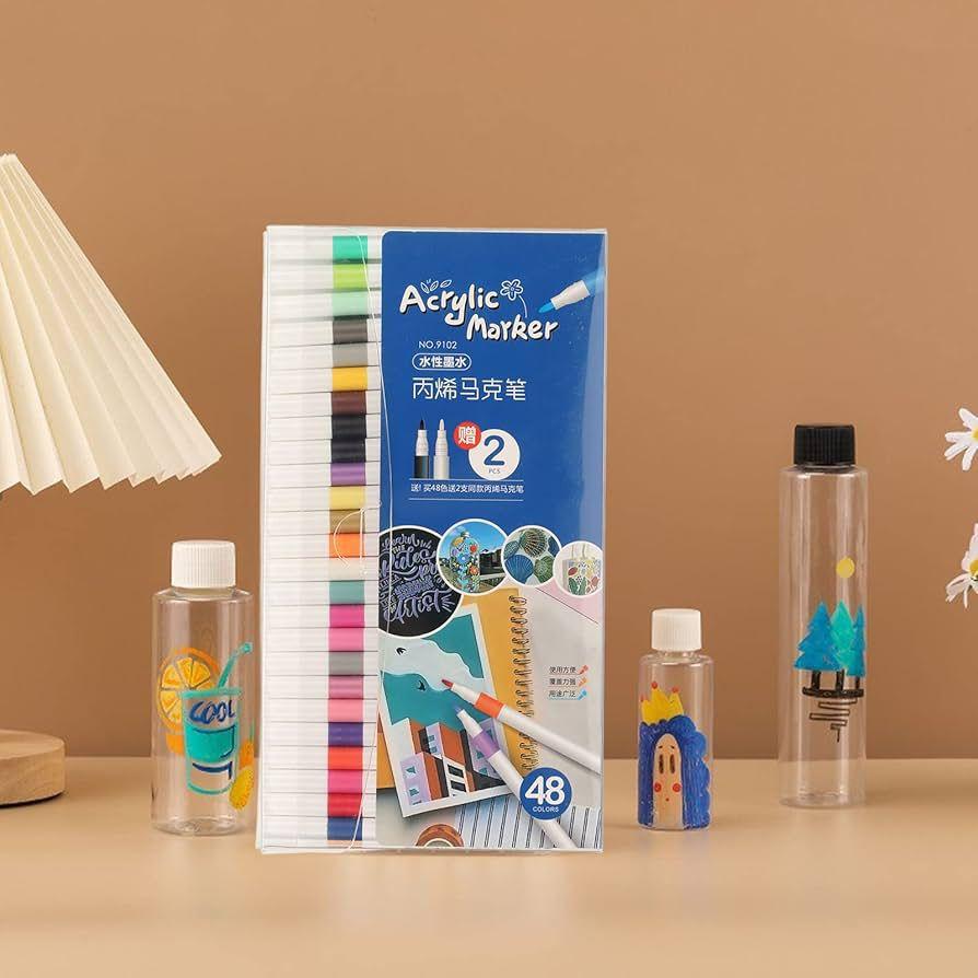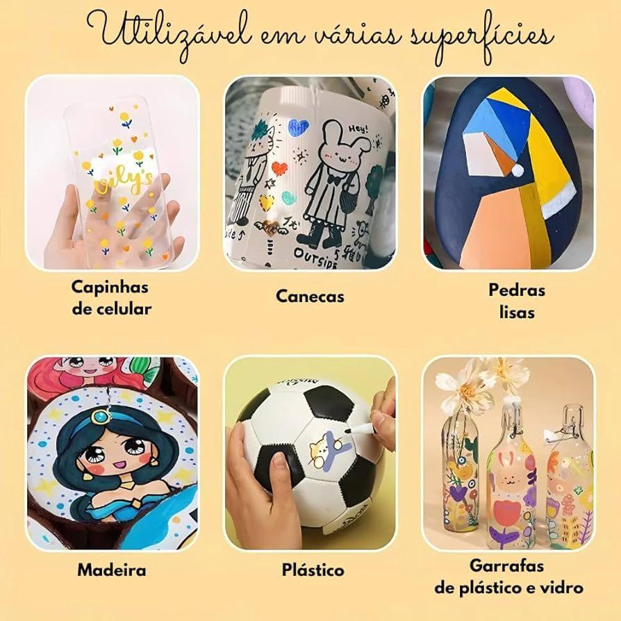 Um sonho para quem ama criar! O kit vem com 48 canetinhas acrílicas super pigmentadas, com cores vibrantes e acabamento perfeito em papel, vidro, plástico, madeira e muito mais 🌈🖍️
