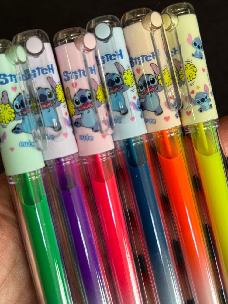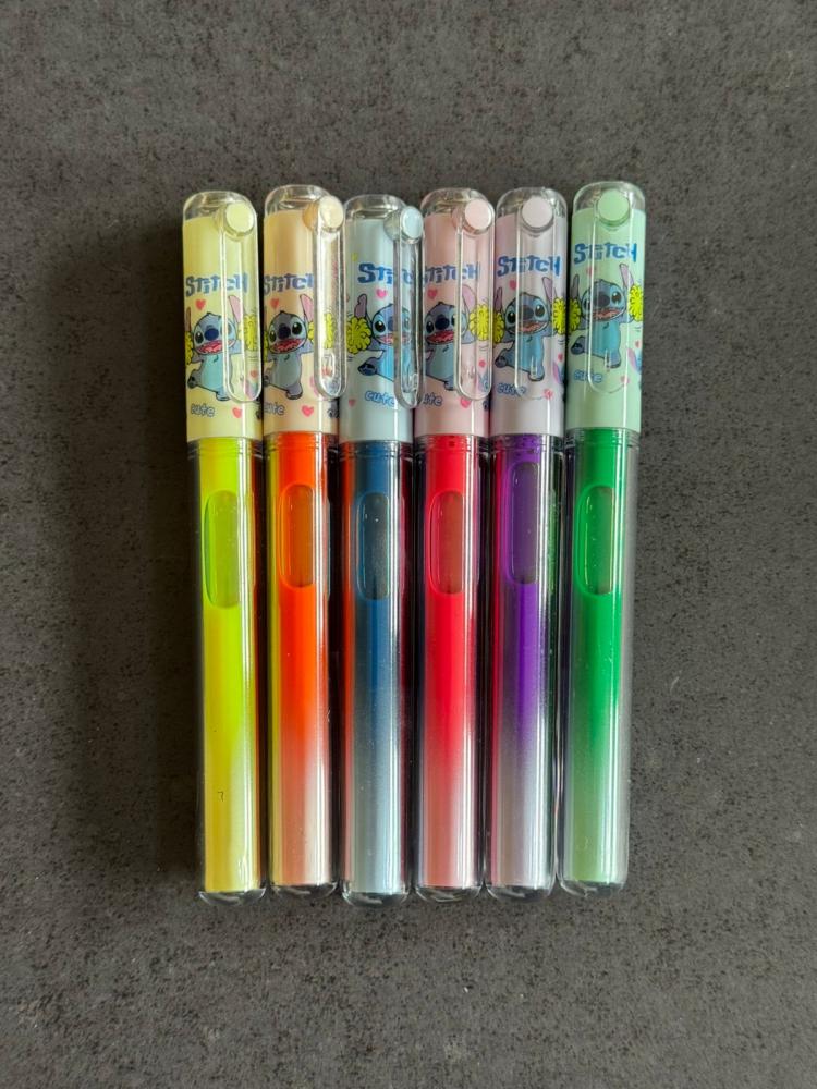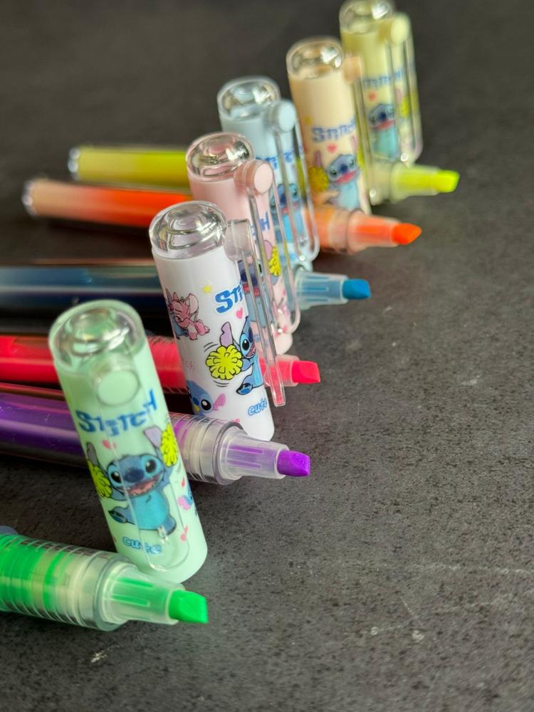 Marca-texto líquido Stitch, ideal para destacar textos com precisão e sem borrar. Possui secagem rápida e design divertido, perfeito para estudos, trabalho e uso diário.