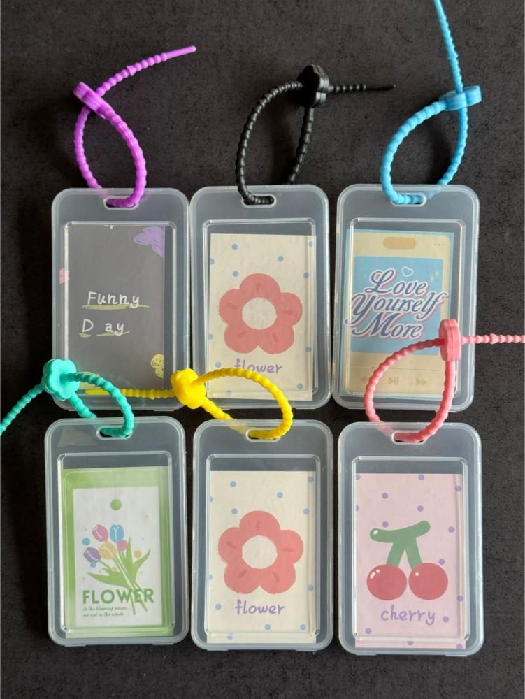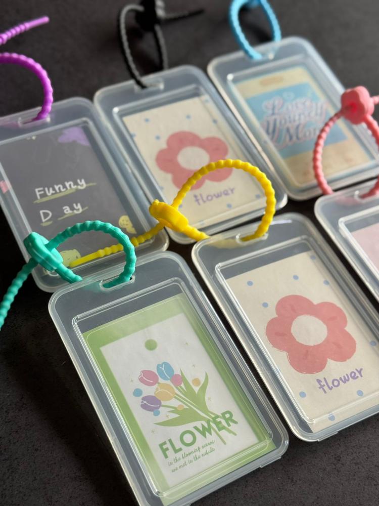 Porta crachá confeccionado em plástico resistente e translúcido, medindo 7 x 11 cm.
