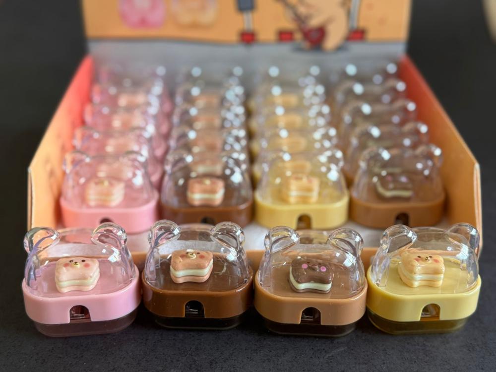 Apontador super fofo com topo transparente em formato de ursinho, deixando o produto ainda mais delicado e divertido. Possui reservatório para armazenar as aparas, ajudando a manter tudo organizado e sem sujeira.